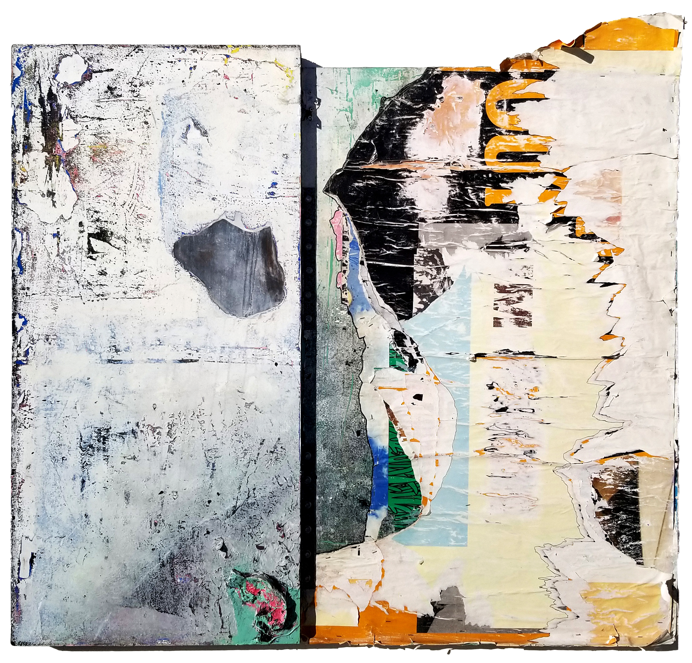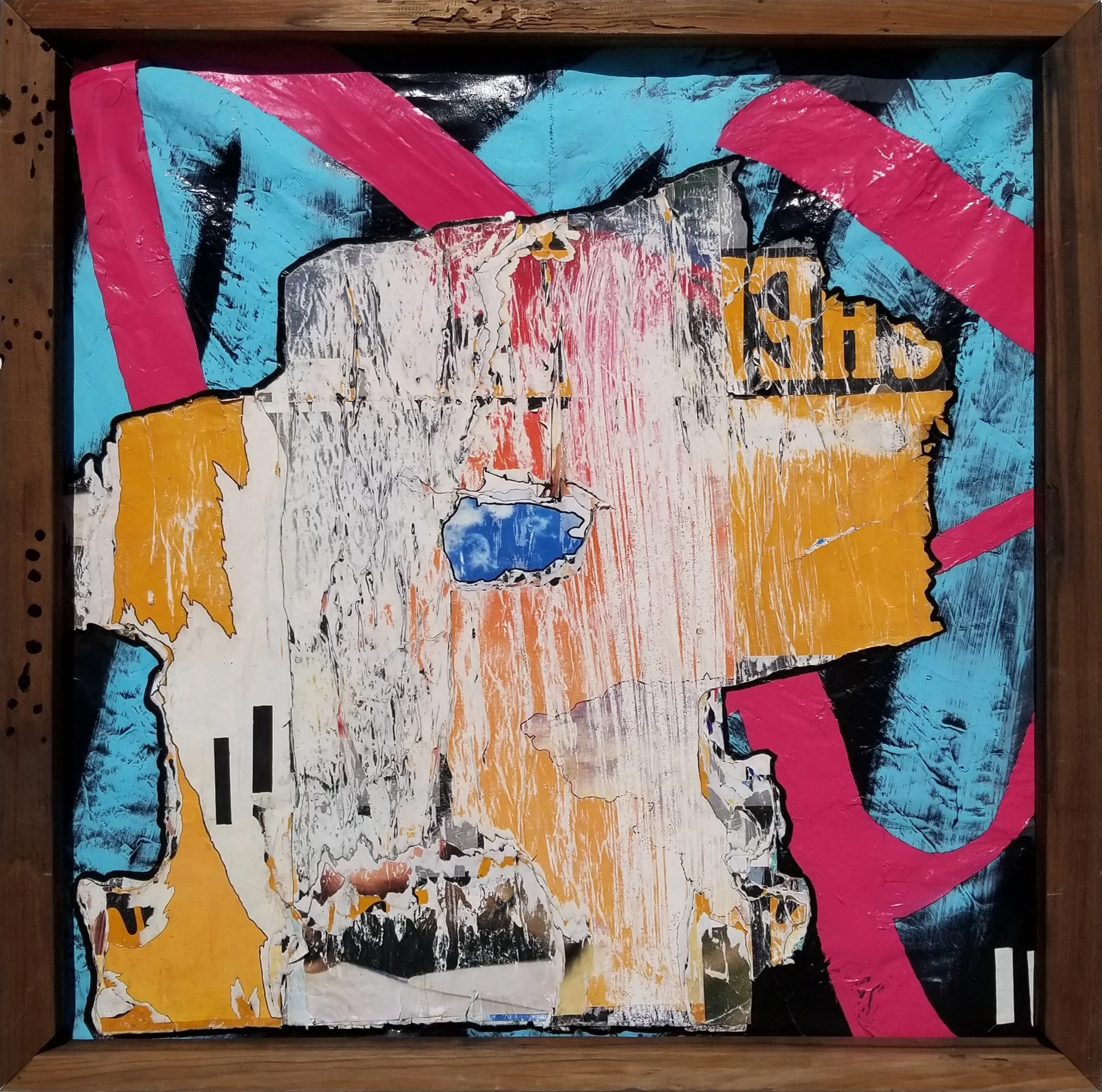 Paper acrylic, latex, enamel, dental floss, Gaffer tape and sharpie on canvas in raw wood frame